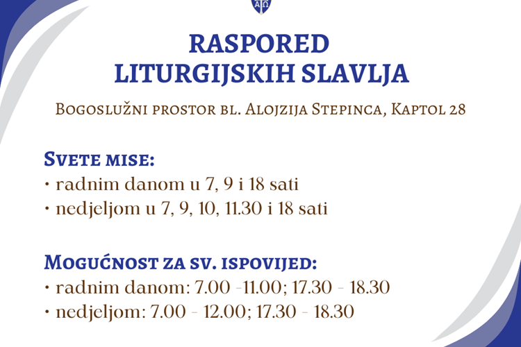 Raspored liturgijskih slavlja u Bogoslužnom prostoru bl. Alojzija Stepinca
