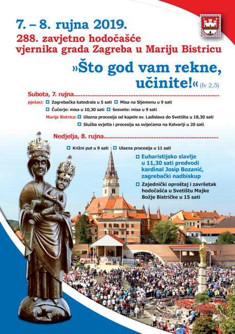 U duhu priprema, priprave i molitve za Susret Hrvatske katoličke mladeži u Zagrebu sljedeće godine, ovogodišnje 288. zavjetno hodočašće vjernika grada Zagreba u Mariju Bistricu održat će se od 7. do 8. rujna pod geslom susreta mladih „Što god vam rekne, učinite!“ (Iv 2,5).