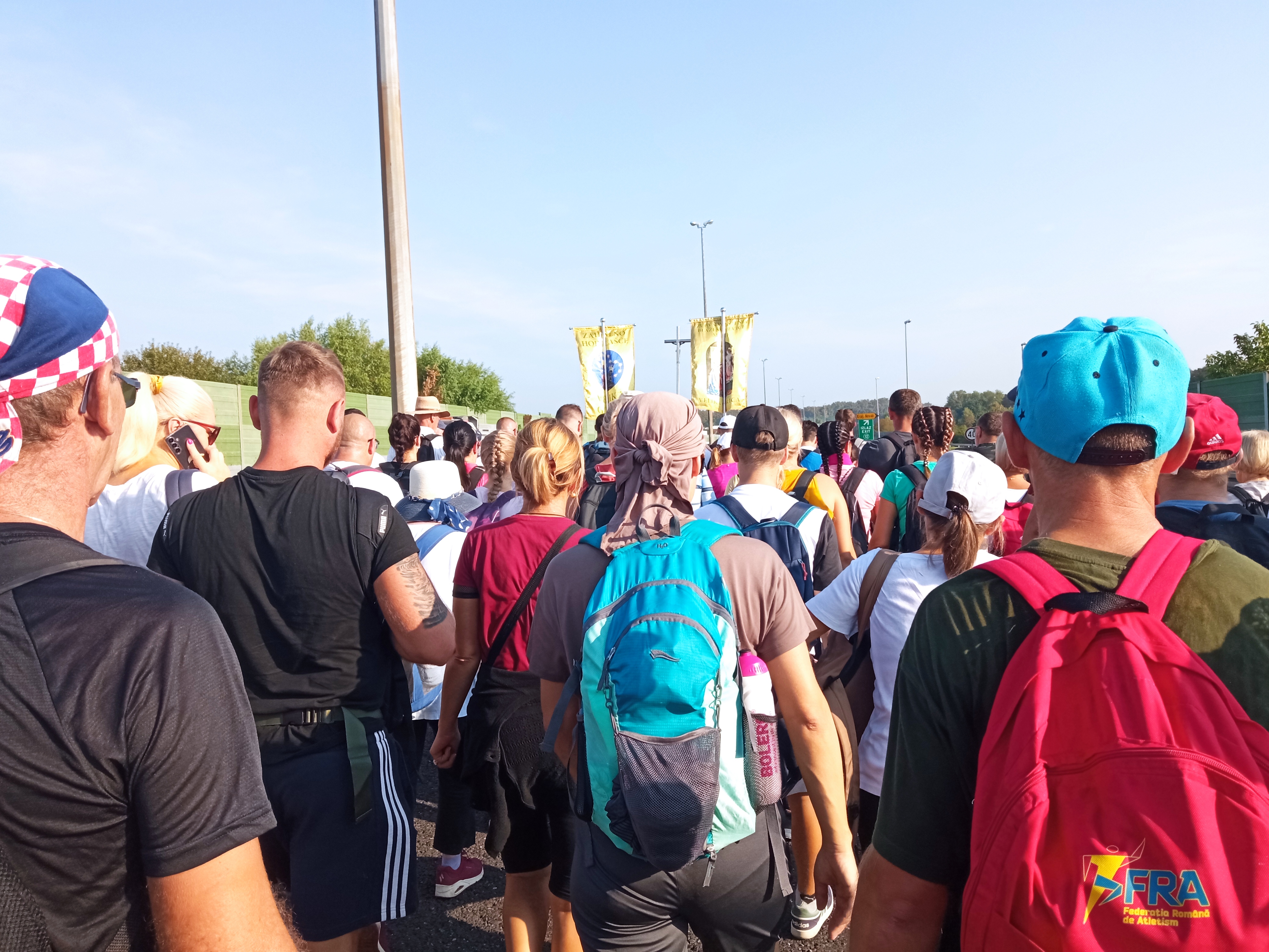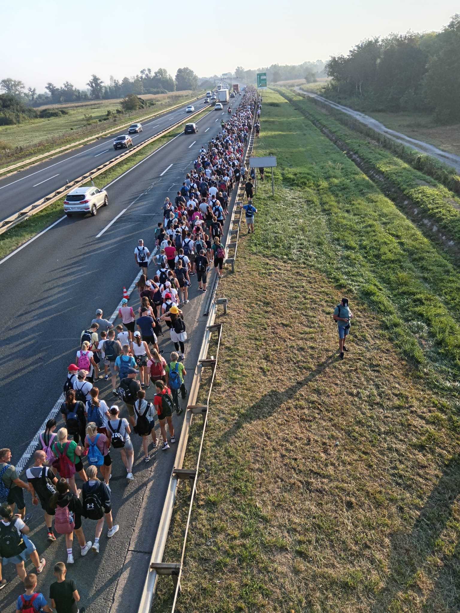 Nakon doručka hodočasnici svih dobi nastavili su dalje za križem autoputom. S krunicom u ruci, u molitvi, pjesmi, razgovoru i tišini hodočasnici, netko po prvi, netko deseti, a netko po trideset i treći put, nosili su svoje zahvale, preporuke, nakane i zamolbe put svetišta u Mariji Bistrici. Ljepota zajedništva i briga jednih za druge liječila je žuljeve, a bolne i umorne noge činila snažnima i ustrajnima. Nakon odmora u Soblincu slijedio je put prema brežuljcima Kašine i Laza. Umorni, ali radosni hodočasnici stigli su u bistričko svetište oko 15 sati, iako su vjernici nastavili pristizati još dugo nakon toga. Uslijedila je zajednička ulazna procesija kojom su hodočasnici pješaci ophodom oko oltara uz pjesmu pozdravili Majku Božju Bistričku.