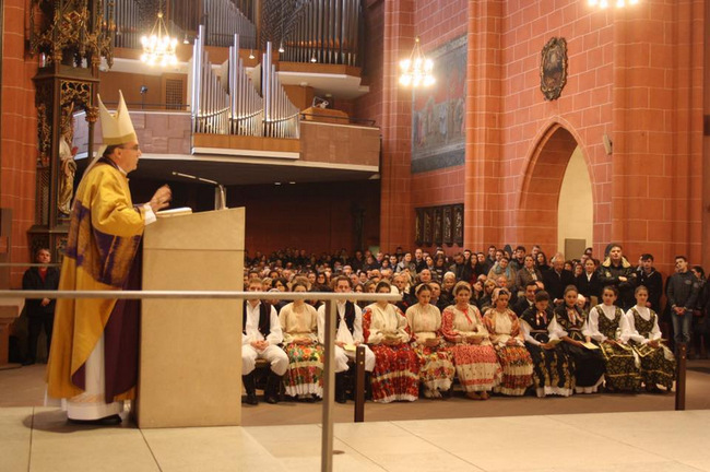 Tu je župna zajednica, tolike aktivnosti u župi, svjedočenje Božje istine, Božje ljubavi po Caritasu, pomoći bližnjemu, a tu su i naši franjevci redovnici koji 50 godina neumorno ovdje vrše svoju svećeničku službu, te naše časne sestre franjevke. Euharistija, sv. misa je spasila naš narod. Ona nas je sačuvala ovdje u ovoj novoj zemlji u koju ste došli. Misa nas je sačuvala da smo ostali ono što jesmo, da smo vjernici i katolici, Hrvati, članovi Katoličke Crkve i dobri članovi zemlje Njemačke. Sv. misa je tijekom povijesti očuvala hrvatski narod", kazao je kardinal te je pozvao sve na obnovu vjernosti prema sv. misi. "Često sam čuo od kolega biskupa iz Njemačke i drugih zemalja kako se hrvatski katolici odlikuju upravo po tome što rado dolaze na nedjeljnu sv. misu. To je ono zbog čega nas i drugi hvale. Ostanimo tome vjerni. Postoje uporišne točke koje su tu da bismo ih se držali kako bismo mogli ostati, rasti i napredovati. Ti stupovi su sv. misa, obitelj i Blažena Djevica Marija. Dajte mjesto Bogu u obitelji.