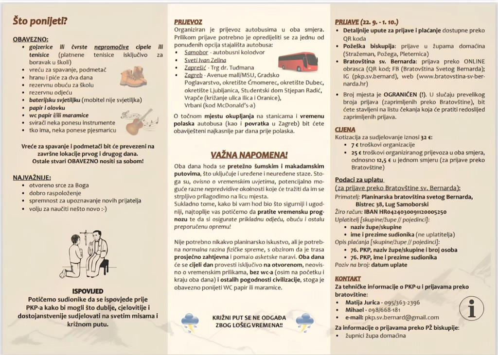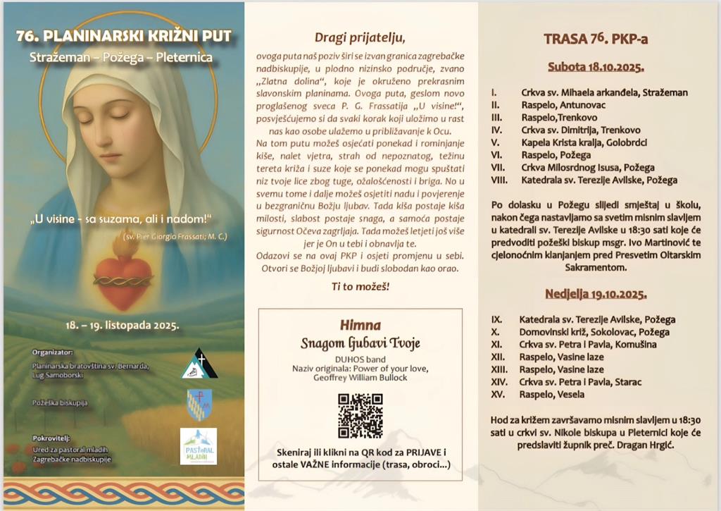 U organizaciji Planinarske bratovštine sv. Bernarda iz Luga Samoborskog te pod pokroviteljstvom Ureda za pastoral mladih Zagrebačke nadbiskupije u subotu i nedjelju, 18. i 19. listopada, pod geslom „U visine - sa suzama, ali i nadom!“ (sv. Pier Giorgio Frassati), održat će se 76. Planinarski križni put na trasi Stražeman - Požega - Pleternica.