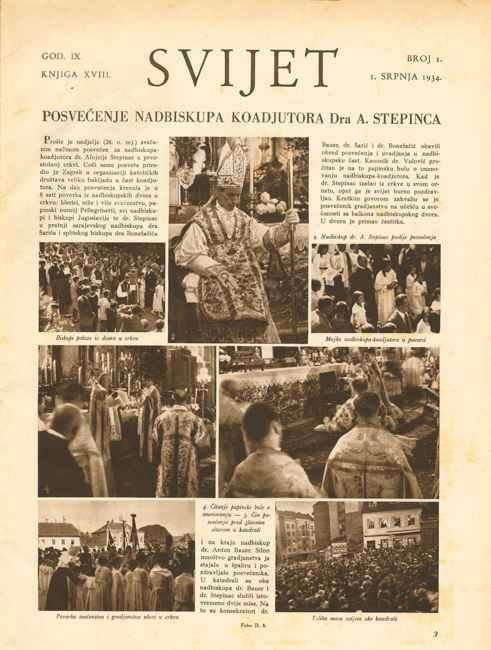 S nadnevkom od 1. srpnja 1934. „Svijet“ donosi reportažu pod naslovom „Posvećenje nadbiskupa koadjutora dra A. Stepinca“ i objavljuje sedam crnobijelih fotografija. Osim poznate fotografije nadbiskupa Stepinca, snimljenog neposredno nakon biskupskog posvećenja, kada u biskupskom ornatu i sa štapom u ruci sjeda na katedru zagrebačkih nadbiskupa, magazin „Svijet“ donosi i fotografije procesije iz Nadbiskupskog dvora prema prvostolnici, Nadbiskupovu majku Barbaru u procesiji, čitanje papinske Bule o imenovanju nadbiskuipa-koadjutora, trenutak obreda ređenja u kojem je nadbiskup Stepinac u prostraciji ispred katedralnog oltara i uz nadbiskupa dr. Antuna Bauera te fotografiju „velike mase svijeta oko katedrale“.