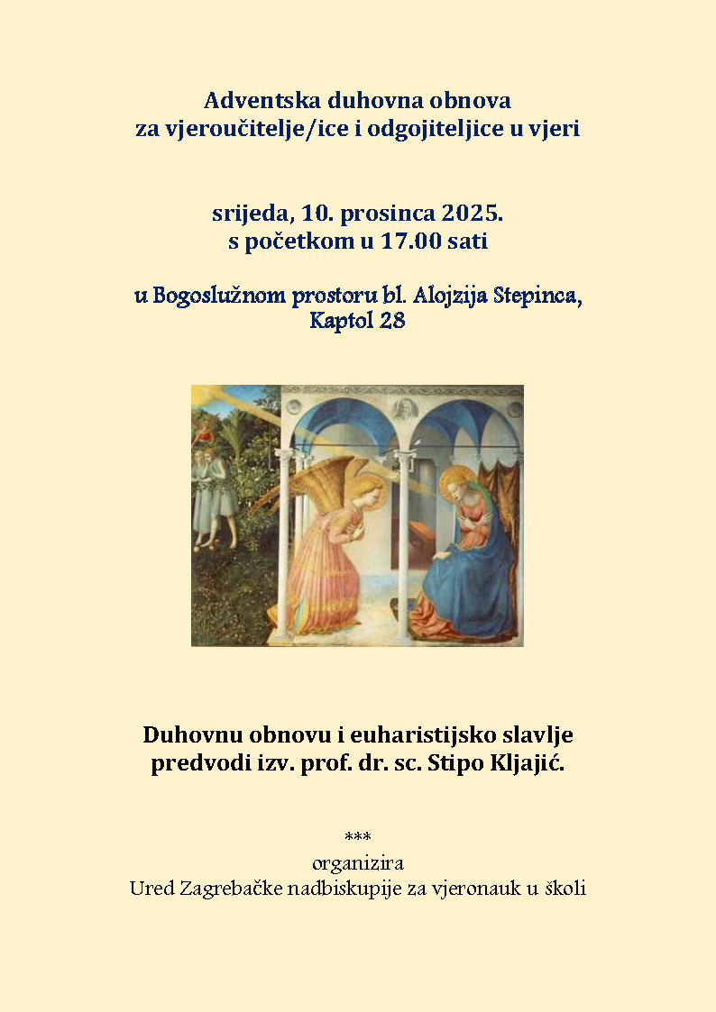 Adventska duhovna obnova za vjeroučitelje/ice i odgojiteljice u vjeri održat će se u srijedu 10. prosinca 2025. s početkom u 17 sati u Bogoslužnom prostoru bl. Alojzija Stepinca, Kaptol 28.