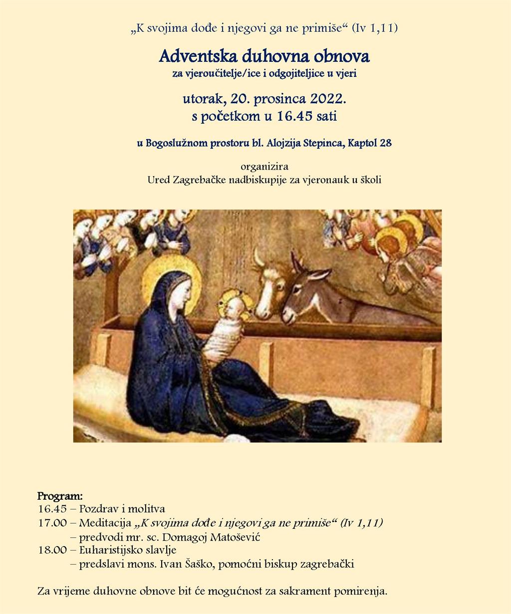 Adventska duhovna obnova za vjeroučitelje/ice i odgojiteljice u vjeri