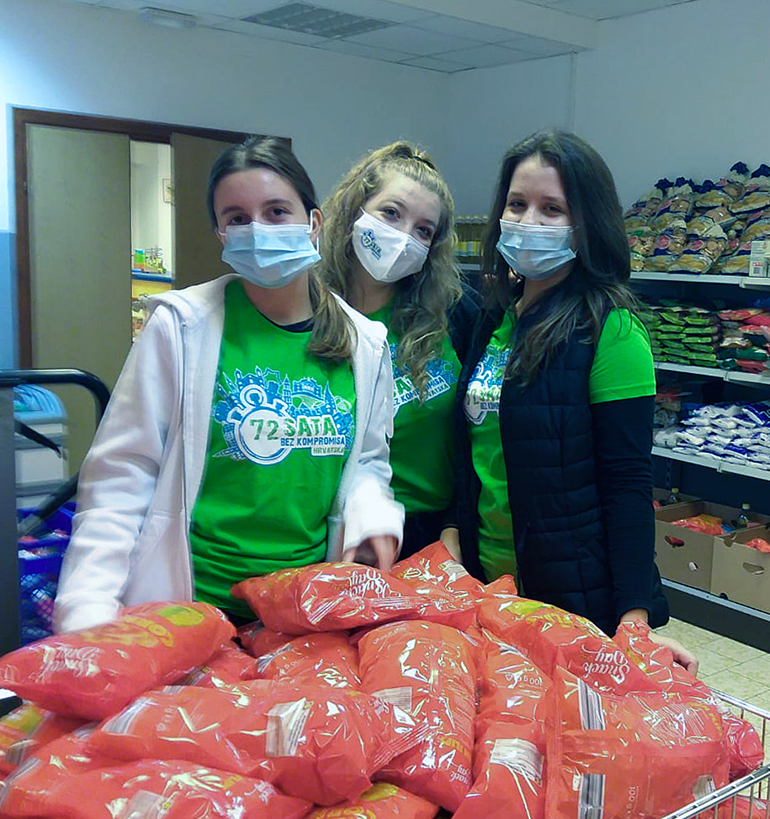 Među prvim ovogodišnjim volonterkama projekta »72 sata bez kompromisa« u zagrebačkom Caritasu bile su tri djevojke koje su slagale artikle na police i pripremale pakete pomoći za potrebite u okviru projekta »Socijalna košarica - podjela pomoći u naravi« u Crnojezerskoj 20 u Susedgradu.
