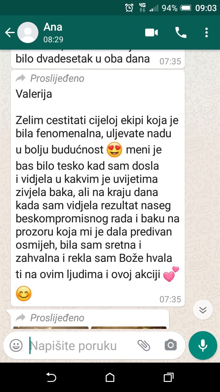 »Želim čestitati cijeloj ekipi koja je bila fenomenalna, uljevate nadu u bolju budućnost �� meni je bas bilo teško kad sam došla i vidjela u kakvim je uvijetima živjela baka, ali na kraju dana kada sam vidjela rezultat našeg beskompromisnog rada i baku na prozoru koja mi je dala predivan osmijeh, bila sam sretna i zahvalna i rekla sam Bože hvala ti na ovim ljudima i ovoj akciji«, izjavila je Valerija (20), studentica Edukacijsko-rehabilitacijskog fakulteta.