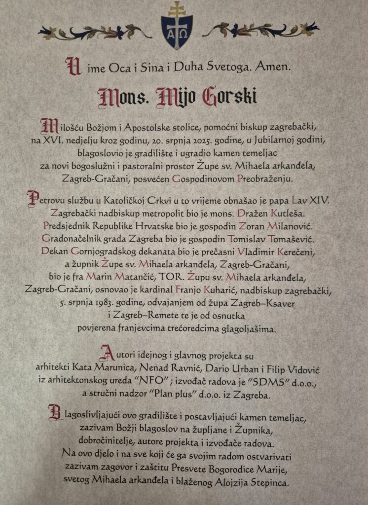 Zagrebački pomoćni biskup Mijo Gorski blagoslovio je u nedjelju 20. srpnja gradilište novoga bogoslužnog i pastoralnog prostora Gospodinova preobraženja u Župi sv. Mihaela arkanđela u zagrebačkim Gračanima.