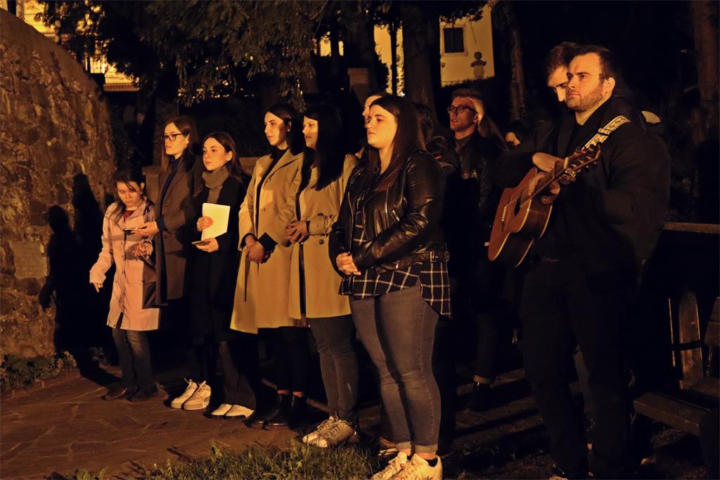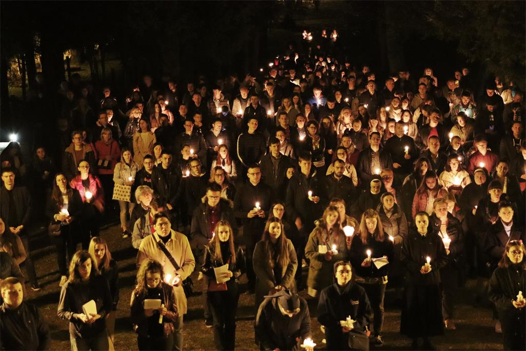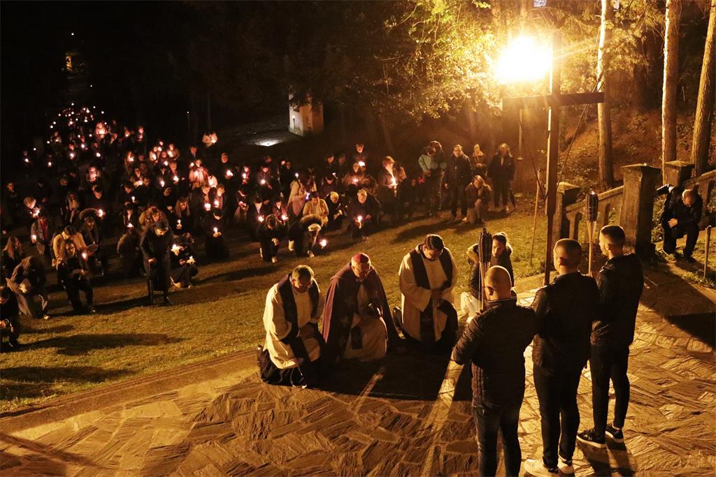 Mladi su u pobožnosti križnoga puta razmatrali tekstove kardinala Angela Comastrija o Božjoj šutnji, ljudskoj oholosti, Božjim padovima pod križem, Mariji Majci ljubavi i prebivalištu nježnosti, Šimunu Cirencu i Veroniki, podjeli svijeta na područja blagostanja i područja bijede, čistoći te vjeri kao jedinoj svjetiljci što obasjava noć svijeta.