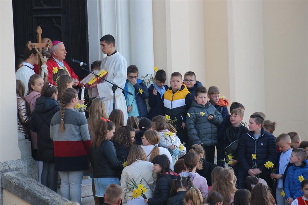 Nakon blagoslova grančica i svečanog ulaska u crkvu u misnom slavlju pjevala se Muka Gospodina našega Isusa Krista po Luki. Na početku homilije biskup Gorski mnogobrojnim okupljenim vjernicima uputio je čestitke i pozdrave kardinala Josipa Bozanića. Zatim je postavio pitanje svakome od nas je li Isus mogao izbjeći toliku patnju za nas.