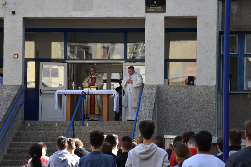 Po završetku misnoga slavlja, a prije završnoga blagoslova, preč. Matija Pavlaković, rektor Sjemeništa i duhovnik Gimnazije, zahvalio je u ime ravnateljice škole prof. Ljube Duvnjak, ocu biskupu na dolasku i nadahnutoj homiliji, posebno pozdravivši ovogodišnje prvaše. Zaželio je svima sretan početak nove školske i vjeronaučne godine kako bi Gospodin svojom blizinom pratio i blagoslovio učenike, profesore i djelatnike Gimnazije, a roditeljima i odgojiteljima udijelio strpljivost i brižnost u služenju mladima koji traže uzore svojih života.