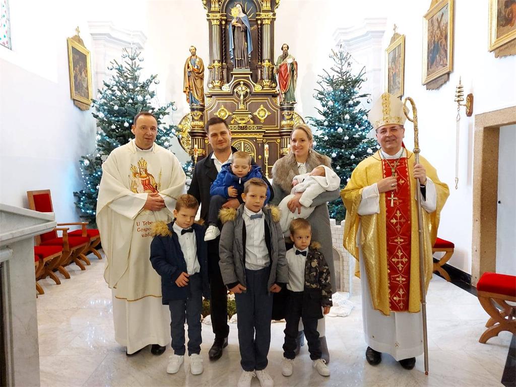 U euharistijskome slavlju, na kojem su koncelebrirali prof. dr. fra Ante Crnčević kao Biskupov pratitelj i domaći župnik vlč. Darko Pužin, sudjelovala su uz roditelje i kumove novokrštenika i njegova braća Jakov, Ivan, Ante i Toma te obitelj i župna zajednica, koja je i u skromnim uvjetima, uzrokovanih epidemiološkim mjerama ograničenoga broja vjernika prisutnih u crkvenome prostoru, pokazala svoju blizinu te iskazala radosnu dobrodošlicu novome članu, što je naglasio i vlč. Pužin u svojem pozdravu, istaknuvši snažan primjer kršćanskih obitelji koje zajedno mole i slave sv. misu, jer nam to svima daje snagu da u nadi budemo radosni, u nevolji strpljivi, u molitvi postojani! (Rim 12,12).