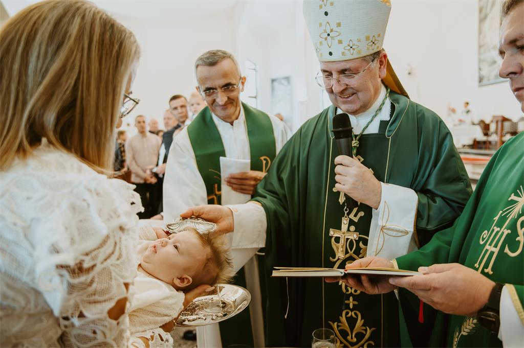U pozdravnom govoru župnik Pavetić zahvalio je mons. Šašku na dolasku te podsjetio da je poseban dan u župnoj zajednici jer obitelj Pelivan daruje Crkvi plod svoje ljubavi, peto dijete, što je poticaj da se bira život i daruje Crkvi.