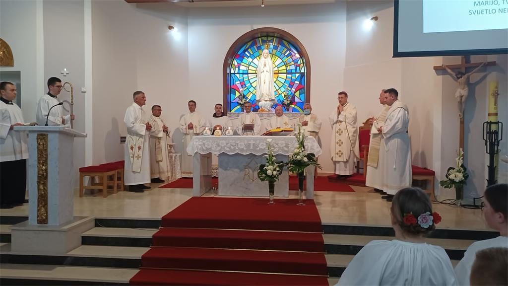 Euharistijsko slavlje na sam dan svetkovine Gospe Fatimske predvodio je mons. Ivan Šaško, zagrebački pomoćni biskup. Svoju propovijed započeo je riječima: “Braćo i sestre, lijepo je biti u ovaj večernji sat s vama u ovom vjerničkom, obiteljskom ozračju, kao što je to činila prva Crkva, tako jednostavno, blisko, svečano, gdje ste si dali i truda i mara da ova vaša Svetkovina bude uistinu vjernička. Evanđeoska riječ koju smo slušali je Svjetlo, Svjetlo koje pred nas stavlja sjaj ključnoga navještaja koji nikada ne bismo smjeli zaboraviti. Ja nisam došao suditi svijetu, nego svijet spasiti. Isus je došao na svijet kao svjetlo. Svrha svjetla nije osuditi mrak, nego mrak rasvijetliti, pronaći moći prostor kroz koji se može probiti zora i omogućiti da se očituje stvarnost koju je pokrila tama. Tako i tama nije bez smisla, jer nam otkriva čežnju za svjetlošću, istinu da smo mi djeca svjetla. Klica u zemlji ne osuđuje zemlju, nego boravi u njoj prepoznavajući snagu kojom izbija na površinu pokazujući lati, stabljiku, cvijet i plodove. Isus i nama govori, ja ne osuđujem. Istinska ljubav makar i odbijena, makar i pogažena nastavlja boljeti, premda ne vjeruješ u onoga tko te voli, on te i dalje voli i nastavlja vjerovati tebi, vjerovati u onu snagu za koju zna da je Bog usadio u tebe. Ako se želi pronaći nešto što bi bilo nalik Božjoj osudi svijeta, može je se vidjeti samo u nevjerojatnosti križa. Na njemu je Bog očitovao svoju osudu, svoju ljubav do kraja koja nas nikada ne ostavlja. Snagu svjetla i snagu osude čovjek osjeća osobito u blizini ljudi koji ga vole i koji mu žele dobro."