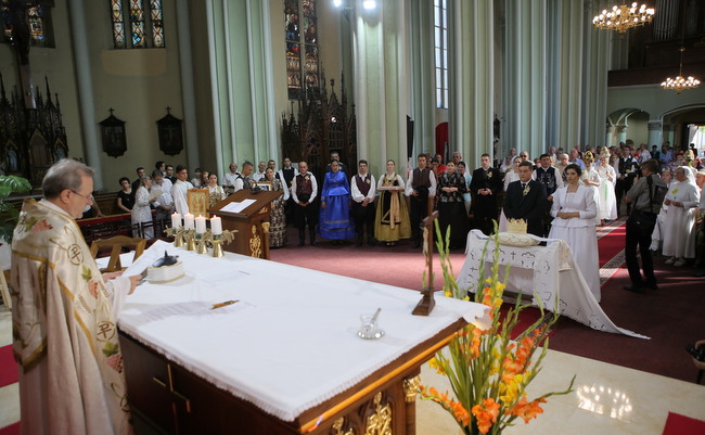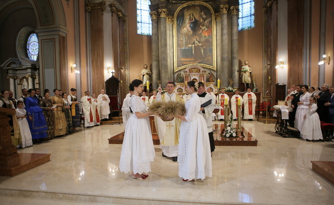 Nakon svega, kada vidimo što je stvorilo predivnu živu baštinu Dužijance, pokušajmo u Crkvi, u obitelji, u društvenome životu progovoriti jezikom malenosti, vječnosti, iščekivanja, zahvalnosti, darovanosti, služenja i radosti, pozvao je biskup Šaško izrazivši uvjerenje da se „taj jezik, temeljno jezik milosti, razumije svugdje. On po Dužijanci uvijek donosi radost. I nikada nije kasno učiti jezik otajstva ljubavi.“ Nastojmo danas, negdje ‘na rubu našega života’, otvoriti prostor za Kristov dar, poput šlinga, dopustiti da kroz taj otvor uđe vječnost koja preobražava, liječi i donosi plodove. Sigurno postoji neka slamnata vlat, neznatna, koja nam se nudi za novu radost, zaključio je biskup Šaško, poručivši: „Krist nam je svojim uskrsnućem i svojim Duhom u ruke, u srce, položio dragocjenu nit i prepustio nam da ljubavlju izvezemo radost za svoje bližnje, u kojoj je i naša radost“. Misno slavlje završilo je pjevanjem zahvalnice „Tebe Boga hvalimo“.