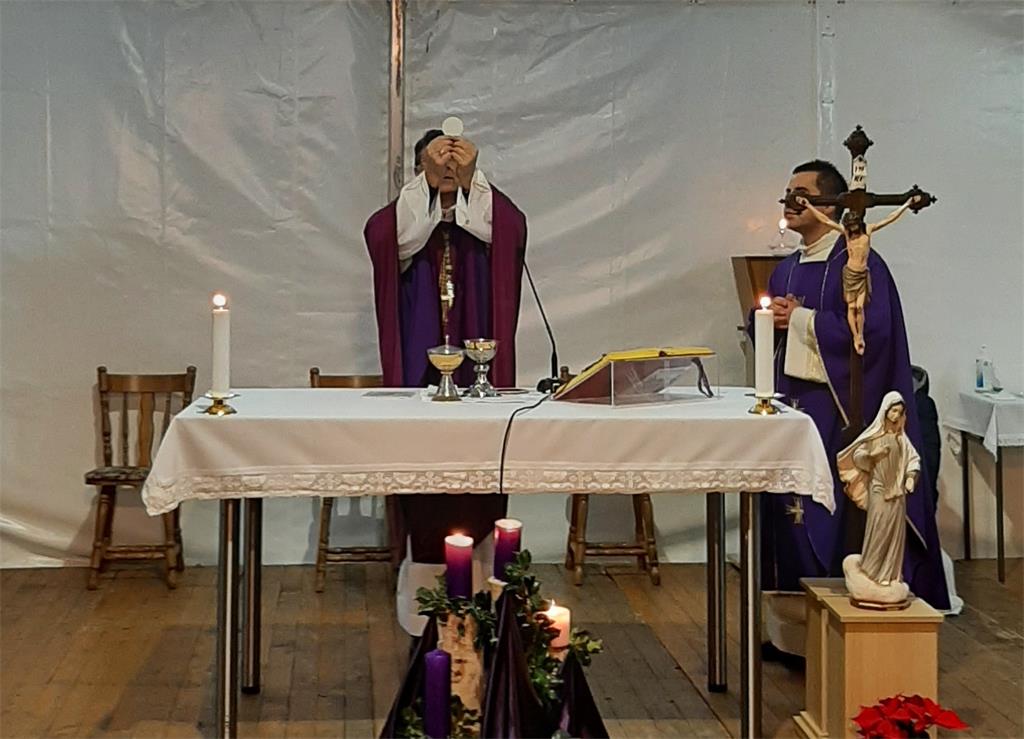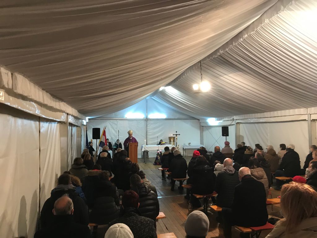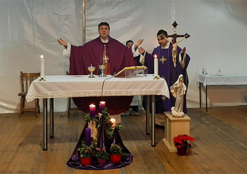 Rosom Duha svoga posveti ove darove. To molimo i jutros. Dok ispovijedamo vjeru i svoje grijehe; dok svoje živote prinosimo kao dar, molimo da ih dodirne i preobrazi rosa Duha; da čuva radost u nama i u našim bližnjima", rekao je u uvodnom obraćanju mons. Ivan Šaško. Također je iskazao radost zbog zajedništva s ovom župnom zajednicom koja euharistiju slavi u šatoru u župnom voćnjaku jer je crkva ozbiljno oštećena u prošlogodišnjim potresima.