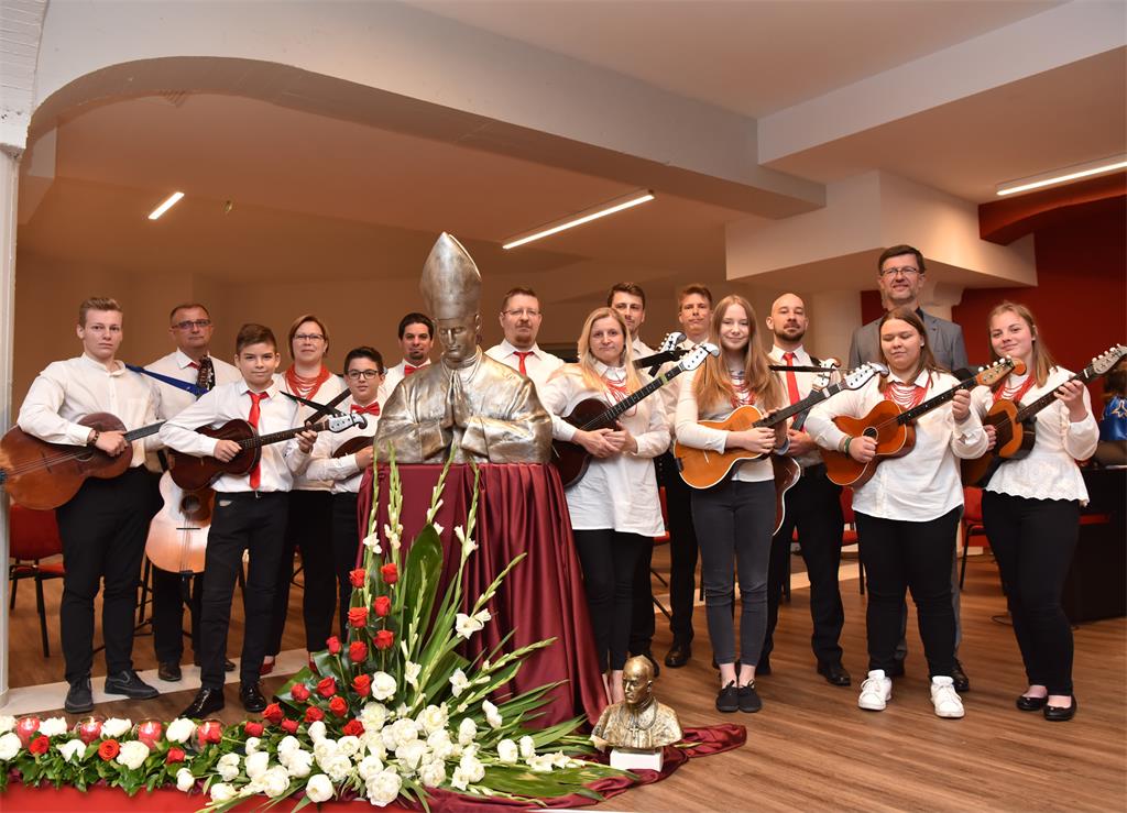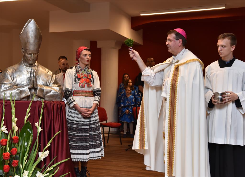 Blagoslov posvećena bl. Alojziju Stepincu. U procesijskom hodu s biskupom Ivanom Šaškom i asistencijom ministranta, mladi u narodnim zaprešićkim nošnjama donijeli su u dvoranu bistu bl. Alojzija Stepinca. Mješoviti župni zbog