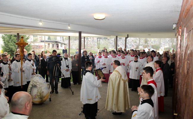 Potom je preč. Matija Pavlaković blagoslovio i zajedno s rektorom Svetišta otvorio novoizgrađena vrata te je okupljeno mnoštvo zajedno sa sjemeništarcima i svećenicima u procesijskom hodu krenulo prema euharistijskome stolu.