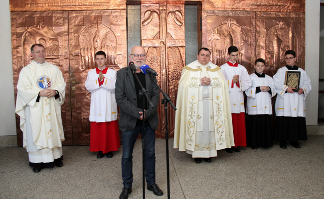 Župnik i čuvar Svetišta mons. Sente izrazio je veliku zahvalnost karlovačkom slikaru i kiparu Željku Marekoviću – Mareku koji je prihvatio izradu novih vrata oblikujući bakrene reljefe postavljene na glavna ulazna vrata Nacionalnog Svetišta, nakon čega je sve prisutne pozdravio sam graditelj Mareković izrekavši svoju viziju nastanka ovog velebnog djela i zahvalio mons. Senteu na ideji te ukazanom povjerenju.