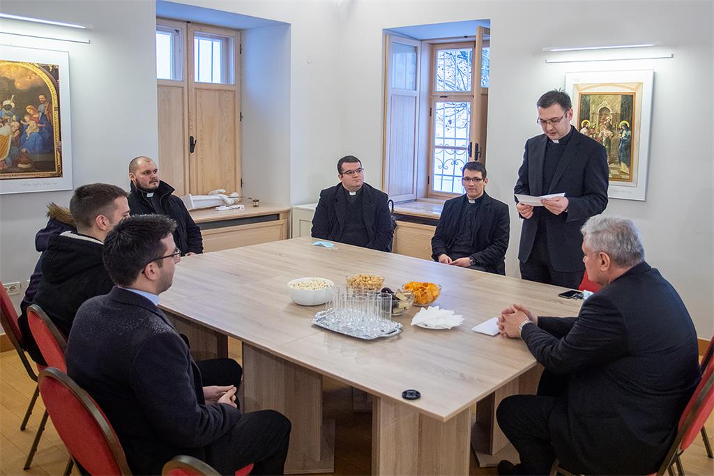 Biskup Košić zahvalio je rektoru, prefektu i predstavnicima bogoslova poručivši kako je iskreno dirnut ovom gestom i darom. Biskup je upoznao goste i s razmjerima stradanja biskupije istaknuvši kako danas od 63 župe u 32 župne crkve u biskupiji nije bilo moguće slaviti misna slavlja jer su one ili srušene ili teško oštećene. (Sisačka biskupija/foto: Timotej Inkret. )