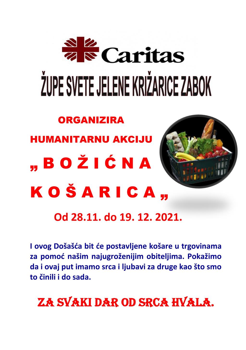 Caritas Župe svete Jelene Križarice u Zaboku organizira akciju „Božićna košarica“ kako bi uljepšali Božić obiteljima slabijeg materijalnog i imovinskog statusa.