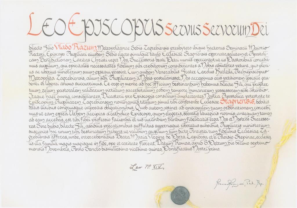 LEO EPISCOPUS SERVUS SERVORUM DEI dilecto Filio VLADO RAZUM, Metropolitanae Sedis Zagrebiensis presbytero ibique hactenus Seminarii Maioris Rectori, Episcopo Auxiliari eiusdem Sedis electo simulque titulo Ecclesiae Stagnensis exornato, salutem et Apostolicam Benedictionem.