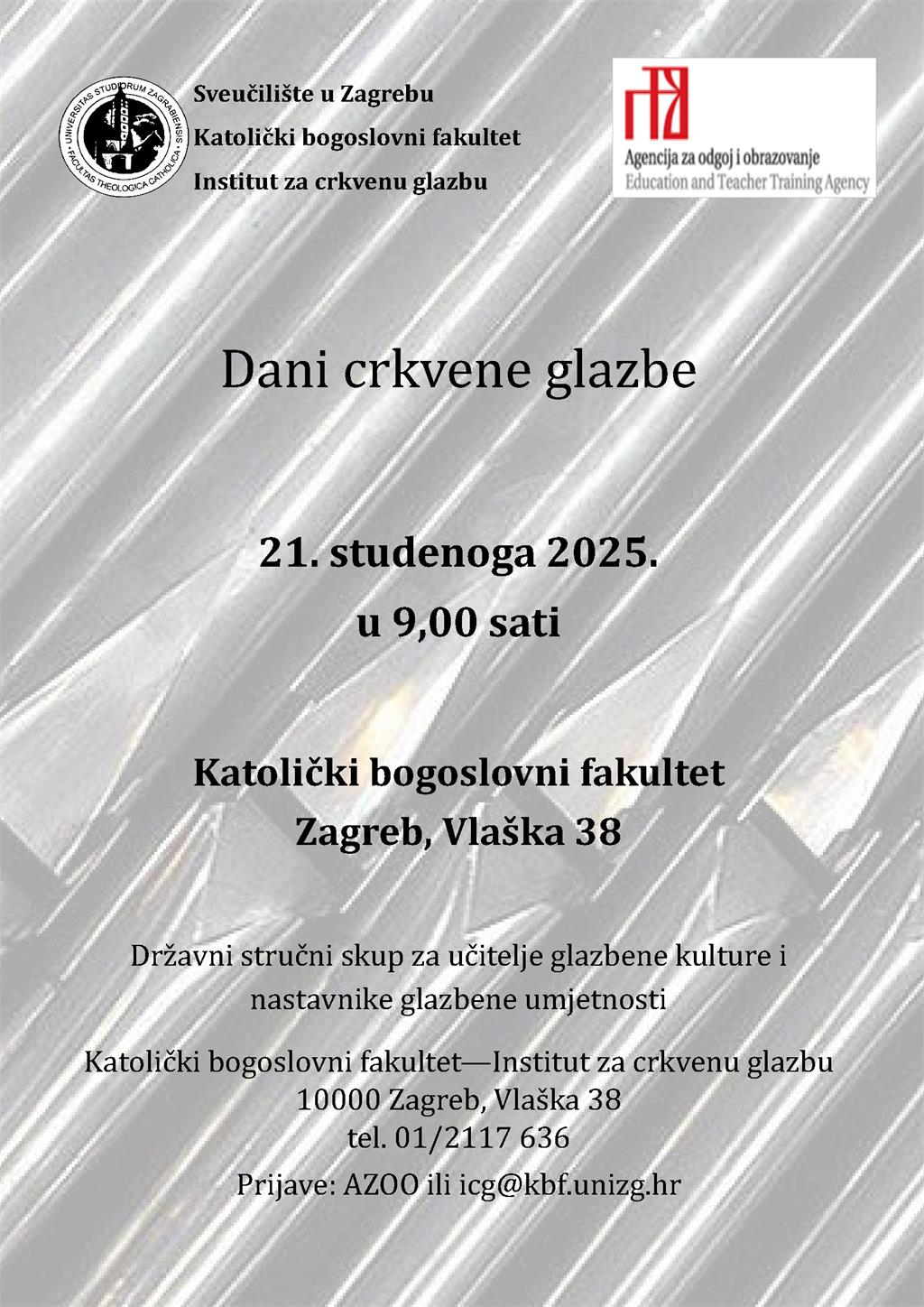 Prijave za stručni skup primaju se prijavom na aplikaciju AZOO za osobe u tom sustavu, a za sve ostale u Tajništvu Instituta za crkvenu glazbu do 20. studenoga (e-pošta: icg@kbf.unizg.hr; tel.: 01/2117 636).