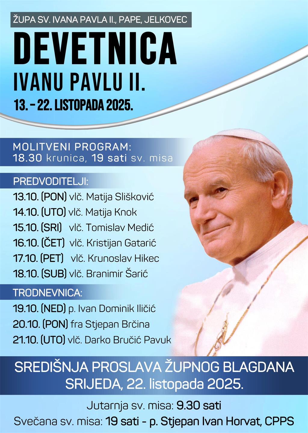 Župa sv. Ivana Pavla II., pape, u Jelkovcu proslavit će svoju župnu svetkovinu u srijedu 22. listopada 2025. godine. Svečano misno slavlje u 19 sati predvodit će p. Stjepan Ivan Horvat, CPPS.