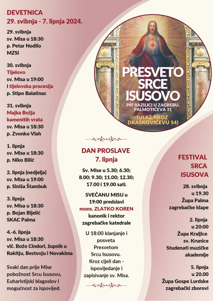 Devetodnevna duhovna priprava za proslavu svetkovine Presvetog Srca Isusova pri istoimenoj bazilici u Palmotićevoj počinje u srijedu 29. svibnja kada će misu u 18:30 predslaviti o. Petar Nodilo, DI. Ostale dane, večernje mise predslave također isusovci, a posljednja tri dana, od 4. do 6. lipnja predslavitelj će biti župnik Župe Blaženog Alojzija Stepinca u Rakitju, Bestovju i Novakima vlč. Božo Cindori. Svaki dan prije mise bit će pobožnost Srcu Isusovu, euharistijski blagoslov i mogućnost za sakrament pomirenja.