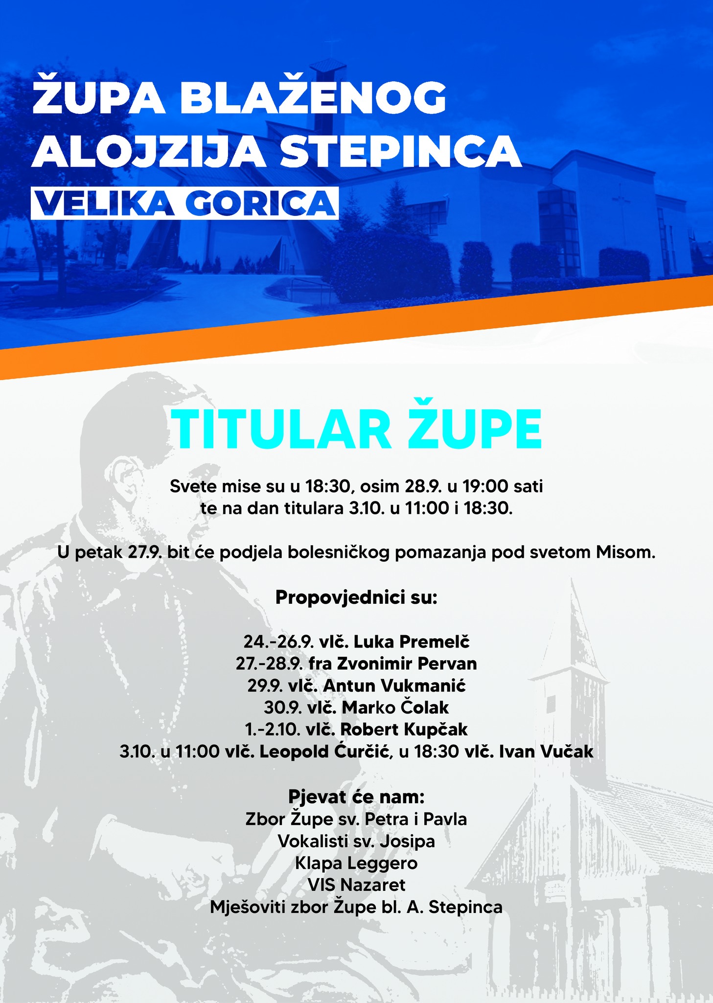 Župa bl. Alojzija Stepinca u Velikoj Gorici svoju župnu svetkovinu proslavit će u četvrtak 3. listopada. Misno slavlje u 11 sati predvodit će vlč. Leopold Ćurčić, upravitelj župe u Vukomercu, a u 18.30 sati preč. Ivan Vučak, upravitelj župa u Krašiću, Oštrcu i Gornjem Prekrižju.
