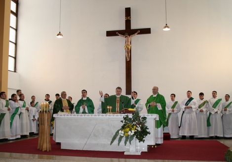 Svečano euharistijsko slavlje u 11 sati predvodio je preč. Anđelko Košćak u koncelebraciji sa dr. Markićem, karlovačkim dekanom Norbertom Ivanom Koprivcem, župnikom Burjom te uz asistenciju ukupno 23 đakona. Božju riječ protumačio je fra Stanko Ćosić koji je istaknuo: „Jedino Bog je onaj koji sve zna. Čovjek se neprestano pita kojim putem krenuti, kako što bolje vršiti volju Božju. Svaki čovjek proživljava iskustvo krize upoznavanja samoga sebe i svoga poziva. Kao Jeremija se susrećemo sa strahom i slabošću pred onim što nas čeka u životu. Najljepši Božji govor jest ljubav. Upravo je ljubav ta koja nam omogućuje da više vidimo od naše djelomičnosti. Ljubav nam otvara oči za ono što još nije, a što će tek biti. Ona nam pokazuje ono što je u mogućnosti. Ljubav mi dopušta puštati staro i uvijek novo prihvatiti, vidjeti ne samo ono djelomično nego nazirati ono savršeno.“ Na kraju svete Mise dvojica zagrebački đakon Filip Pavlović i karmelićanin Danijel Čolo svjedočili su o svojem pozivu, što je vjernike posebno taknulo te su pljeskom i molitvom dali ohrabrenje đakonima prema konačnom cilju – svećeništvu.