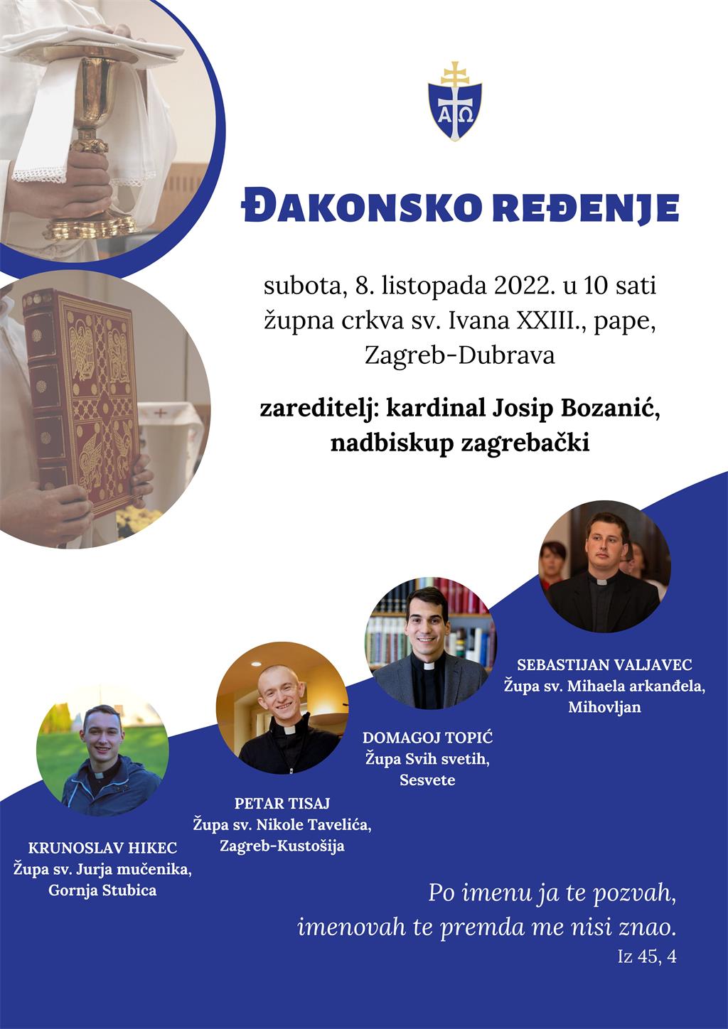 Zagrebački nadbiskup kardinal Josip Bozanić predvodit će u subotu 8. listopada 2022. godine u 10 sati svečano euharistijsko slavlje u župnoj crkvi sv. Ivana XXIII., pape, u zagrebačkoj Dubravi tijekom kojeg će za đakone zarediti 13 kandidata.