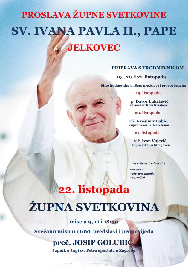 U Župi svetog Ivana Pavla II., pape svečano se proslavlja trodnevnica uoči samog blagdana u subotu 22. listopada. Svečano misno slavlje na sam blagdan predvodi preč. Josip Golubić, župnik Župe sv. Petra u Zagrebu i dekan Maksimirsko-trnjanskog dekanata.