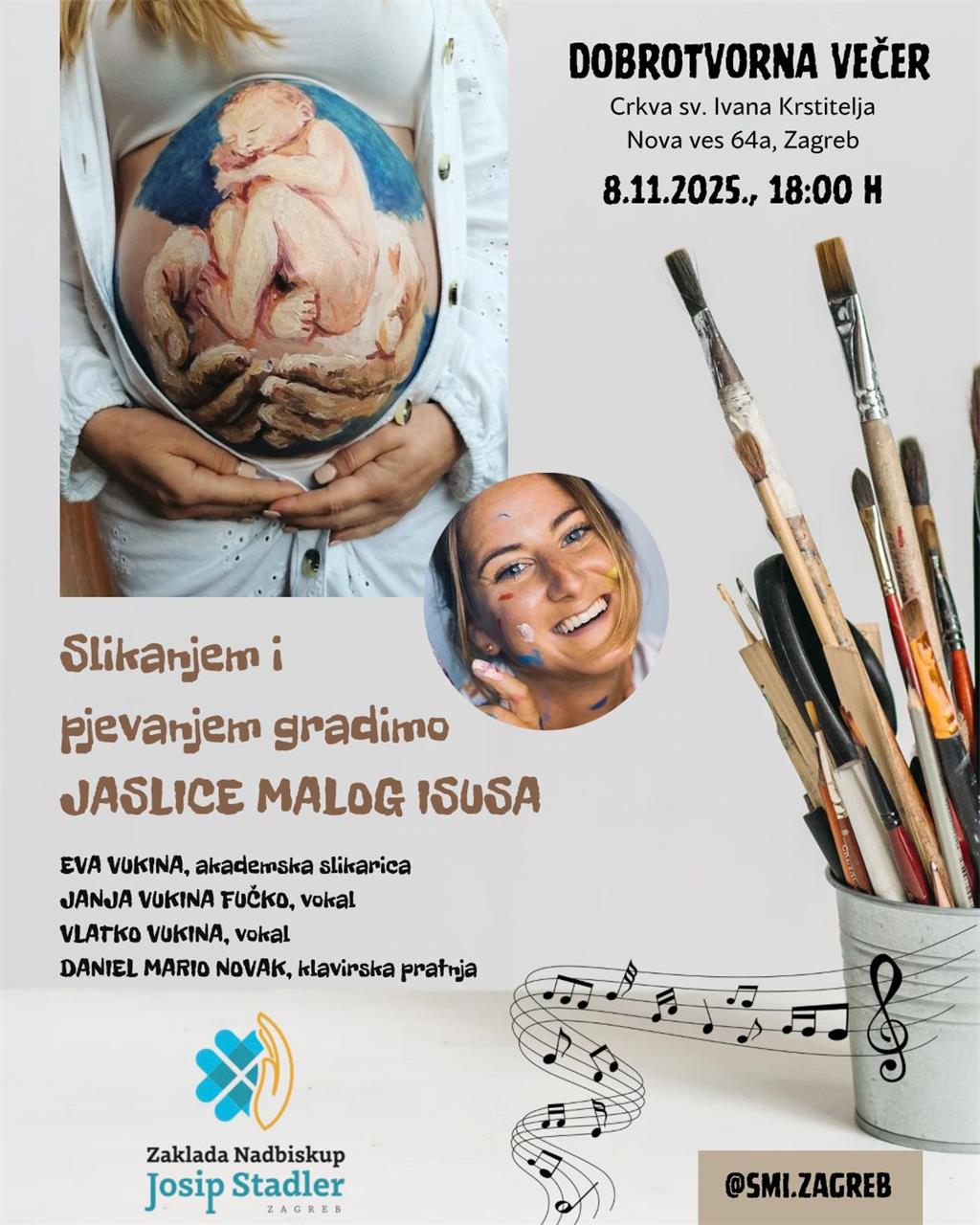 Dobrotvorna večer - koncert za Zakladu „Nadbiskup Josip Stadler“ pod nazivom „Slikanjem i pjevanjem gradimo Jaslice Malog Isusa“ sa slikaricom Evom Vukinom održat će se u subotu 8. studenog, s početkom u 18 sati u župnoj crkvi sv. Ivana Krstitelja (Nova Ves 64a, Zagreb).