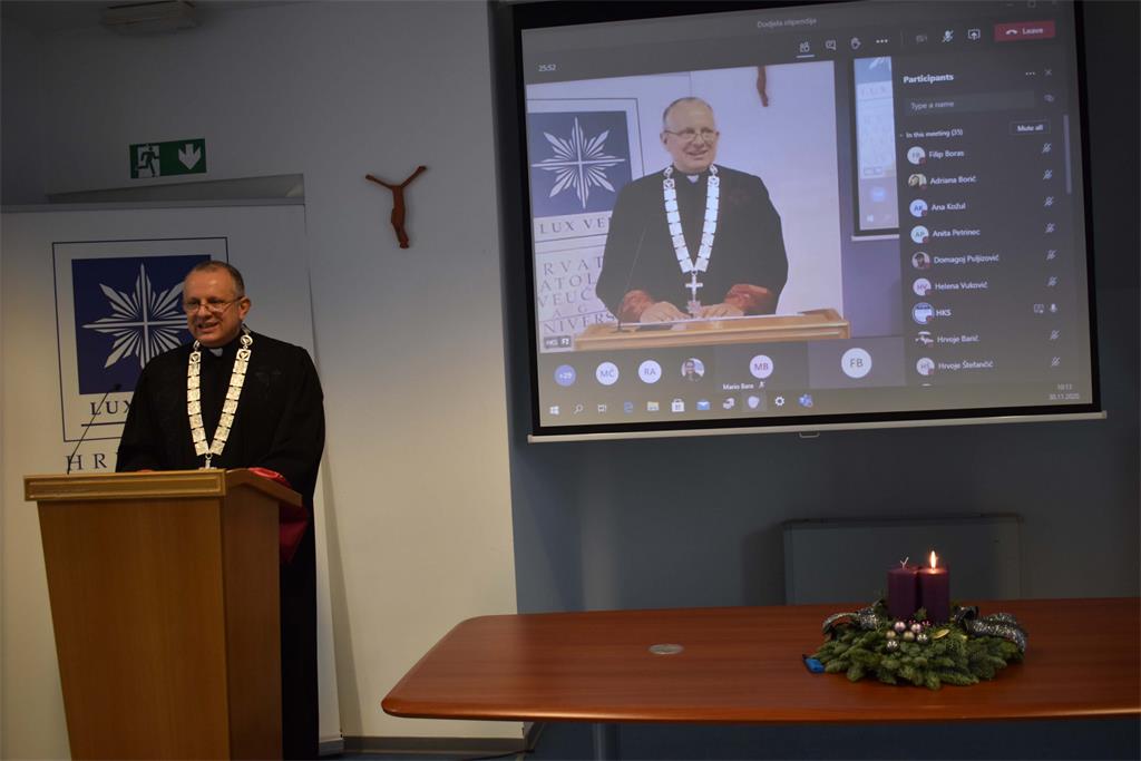 „Stipendije koje dodjeljujemo izričaj su solidarnosti, zajedništva i brige našeg Sveučilišta i naše Crkve za vas, dragi studentice i studenti. Ne radi se o ogromnim sredstvima, ali vjerujemo da će vam ona u ovim kriznim vremena olakšati studiranje u ovoj akademskoj godini. Stipendije koje dodjeljujemo iz vlastitih sredstava i donacije gospodina Marka Franovića, samo su dio brige Sveučilišta za studentski standard. Za Ovom prigodom želim zahvaliti i Američkoj biskupskoj konferenciji koja stipendira studiranje naših asistenata na doktorskim studijima te Zakladi Renovabis Njemačke biskupske konferencije koja, osim financiranja projekata našeg Sveučilišta, jednim dijelom financijski podupire i doktorande na našem Sveučilištu. Sva ta materijalna sredstva izričaj su ljudske i kršćanske duhovne brige za studente: studente sportaše, studente s invaliditetom, studenta slabijeg socioekonomskog statusa, studente bez odgovarajuće roditeljske skrbi, a osobito za one koji su se iskazali izvrsnošću u studiranju i koji su veliki ponos našega Sveučilišta- Svima vam od srca čestitam! Neka ova stipendija bude poticaj za još bolje studiranje, potpora za još bolje izgrađivanje našeg Sveučilišta kao i vašeg osobnog i zajedničkog života.“