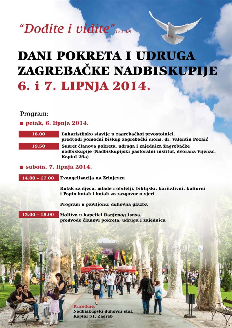Dani pokreta i udruga Zagrebačke nadbiskupije s geslom „Dođite i vidite" (Iv 1,39), a u organizaciji Nadbiskupskog duhovnog stola održat će se 6. i 7. lipnja.