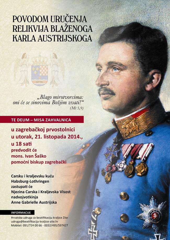 Na blagdan bl. Karla Austrijskog, u utorak 21. listopada u 18 sati u zagrebačkoj prvostolnici pomoćni zagrebački biskup mons. Ivan Šaško predvodit će svetu misu zahvalnicu prigodom uručenja relikvija blaženoga Karla Austrijskoga.