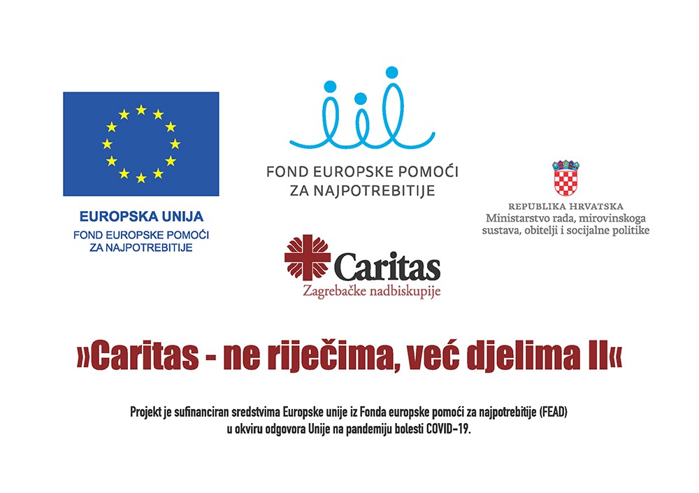Tijekom studenog ove godine Caritas Zagrebačke nadbiskupije organizirao je drugu podjelu od 3.996 paketa hrane u okviru projekta »Caritas - ne riječima već djelima II«, vrijednog 4.067.642,98 kuna, koji je sufinanciran je sredstvima Europske unije iz Fonda europske pomoći za najpotrebitije (FEAD) u okviru odgovora Unije na pandemiju bolesti COVID-19.
