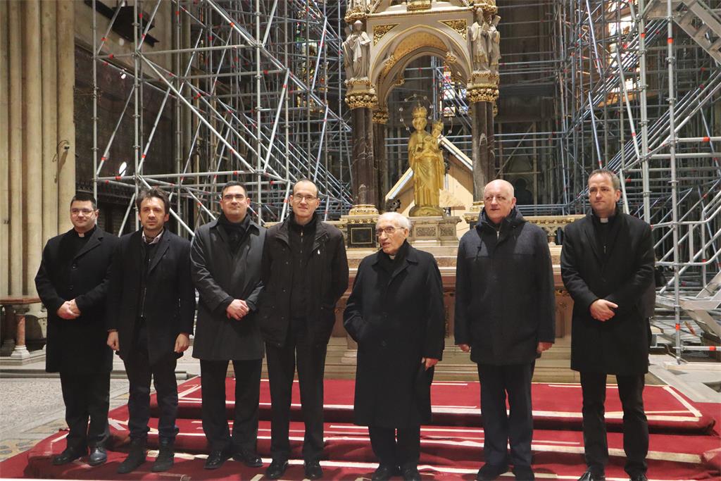 Pred katedralom su kardinala dočekali potpredsjednik Odbora za obnovu katedrale mons. Zlatko Koren i upravitelj Nadbiskupskog dvora i ravnatelj Ustanove za uzdržavanje klera i drugih crkvenih službenika preč. Ivica Budinšćak, pročelnik Tiskovnog ureda i vicepostulator za kauze beatifikacije i kanonizacije Zagrebačke nadbiskupije preč. Tomislav Hačko, župnik Župe sv. Blaža u Zagrebu preč. Borna Puškarić, glavni urednik Glasa Koncila Branimir Stanić i gospođa Dorothea Puškarić.