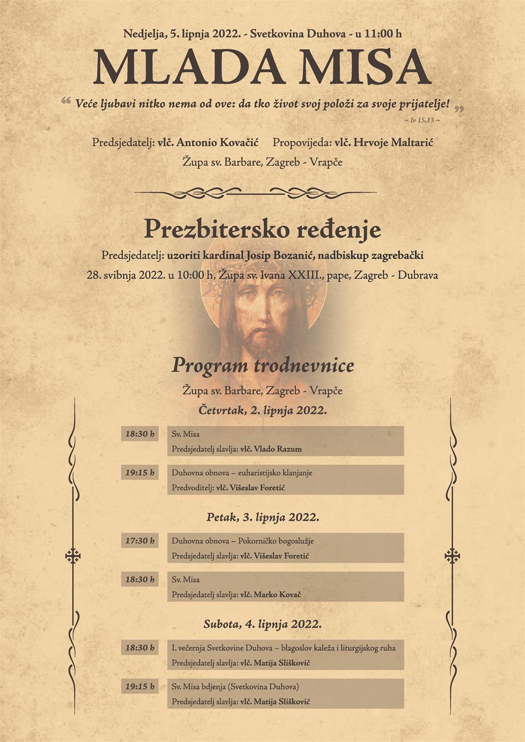u petak 3. lipnja svetu misu u 18:30 sati predvodi i propovijeda preč. Marko Kovač, biskupski vikar i kancelar Nadbiskupskog duhovnog stola;