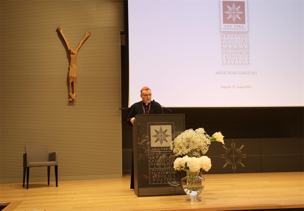 Pozdravnu riječ okupljenim predstavnicima institucija, djelatnicima i studentima uputili su rektor Hrvatskog katoličkog sveučilišta u Zagrebu prof. dr. sc. Željko Tanjić, dekan Medicinskog fakulteta HKS-a prof. dr. sc. Dalibor Karlović, ministar zdravstva izv. prof. dr. sc. Vili Beroš i u ime ministra znanosti i obrazovanja državni tajnik Ivica Šušak.