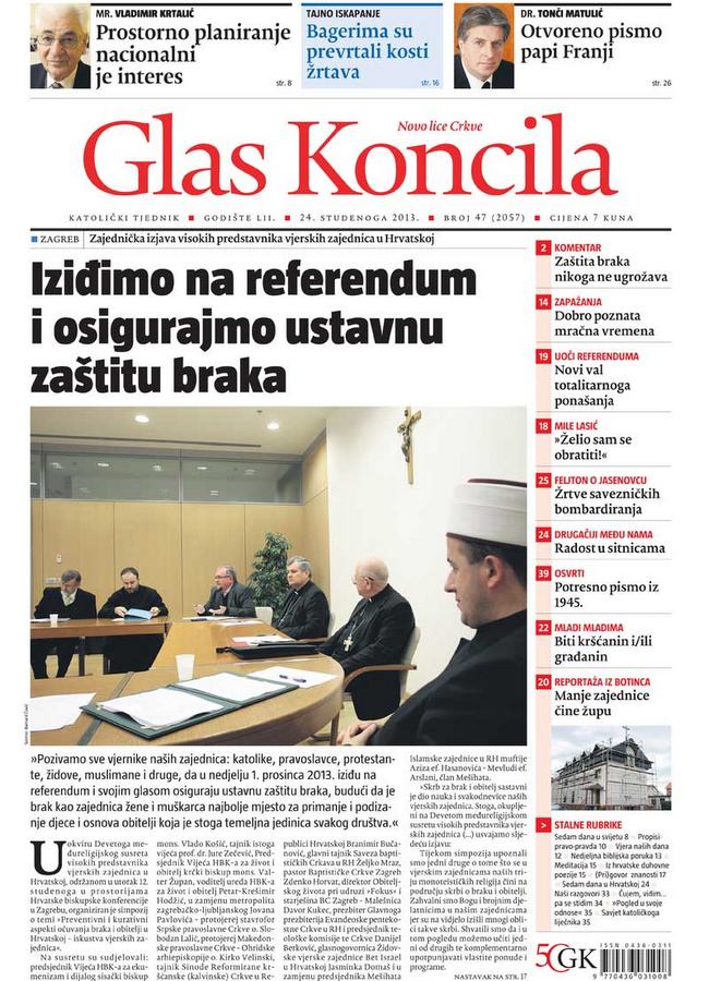 Cijeli je novi broj Glasa Koncila, s nadnevkom nedjelje 24. studenoga, očekivano prožet nastupajućim referendumom o zaštiti braka. Na naslovnici je objavljena izjava predstavnika vjerskih zajednica u Republici Hrvatskoj sažeta u jasnome pozivu: "Pozivamo sve vjernike naših zajednica katolike, pravoslavce, protestante, židove, muslimane i druge, da u nedjelju 1. prosinca 2013. iziđu na referendum i svojim glasom osiguraju ustavnu zaštitu braka, budući da je brak kao zajednica žene i muškarca najbolje mjesto za primanje i podizanje djece i osnova obitelji koja je temeljna jedinica svakoga društva".