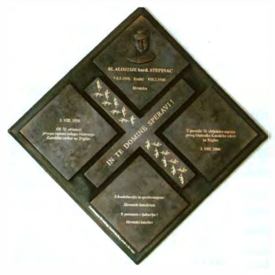Foto: Spomen-ploča postavljena 5. kolovoza 2006. u kapeli Majke Božje Snježne na Kredarici, podno Triglava u Sloveniji, u spomen 70. obljetnice uspinjanja bl. Alojzija Stepinca na Triglav.