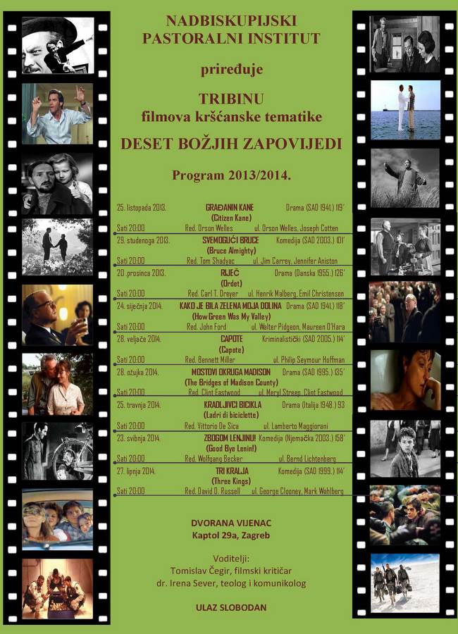 I ove godine, četvrte u nizu, Nadbiskupijski pastoralni institut u Zagrebu priređuje tribinu filmova kršćanske tematike. Ovogodišnja tema tribine je „Deset Božjih zapovijedi“.