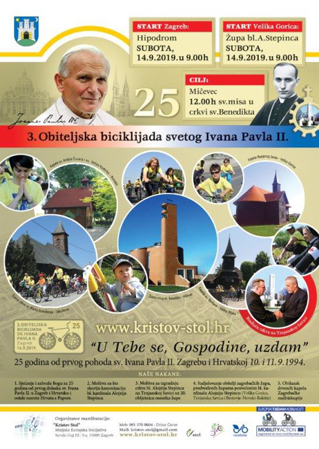 Povodom 25. godišnjice prvog dolaska sv. Ivana Pavla II. u Zagreb i Hrvatsku (10 do 11. rujna 1994.), , Kristov Stol - Misijska Europska inicijativa u subotu 14. rujna u 9 sati organizira Treću zagrebačku obiteljsku biciklijadu za obitelji svih zagrebačkih župa, posebice onih posvećenih blaženome Alojziju Stepincu, te svim zainteresiranima pod Stepinčevim geslom: „U Tebe se, Gospodine, uzdam!“, što je ujedno bilo i geslo prvoga pohoda sv. Ivana Pavla II. Hrvatskoj.