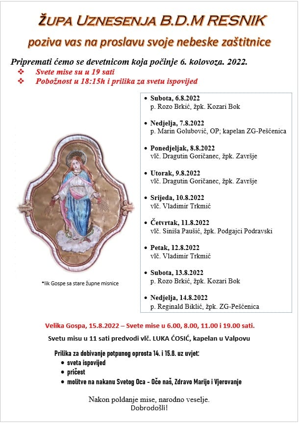 Župa Uznesenja BDM Zagreb – Resnik za proslavu svoje nebeske zaštitnice pripravlja se devetnicom od 6. do 14. kolovoza. U 18.15 sati svakoga dana počinje molitva krunice, pjevane litanije i prilika za ispovijed.
