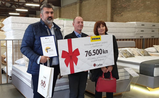 U povodu otvaranja nove tvornice madraca PRIMA GRUPA je Caritasovom prihvatilištu za beskućnike u Sesvetskom Kraljevcu donirala podnice i madrace ukupne vrijednosti 76.500 kuna.