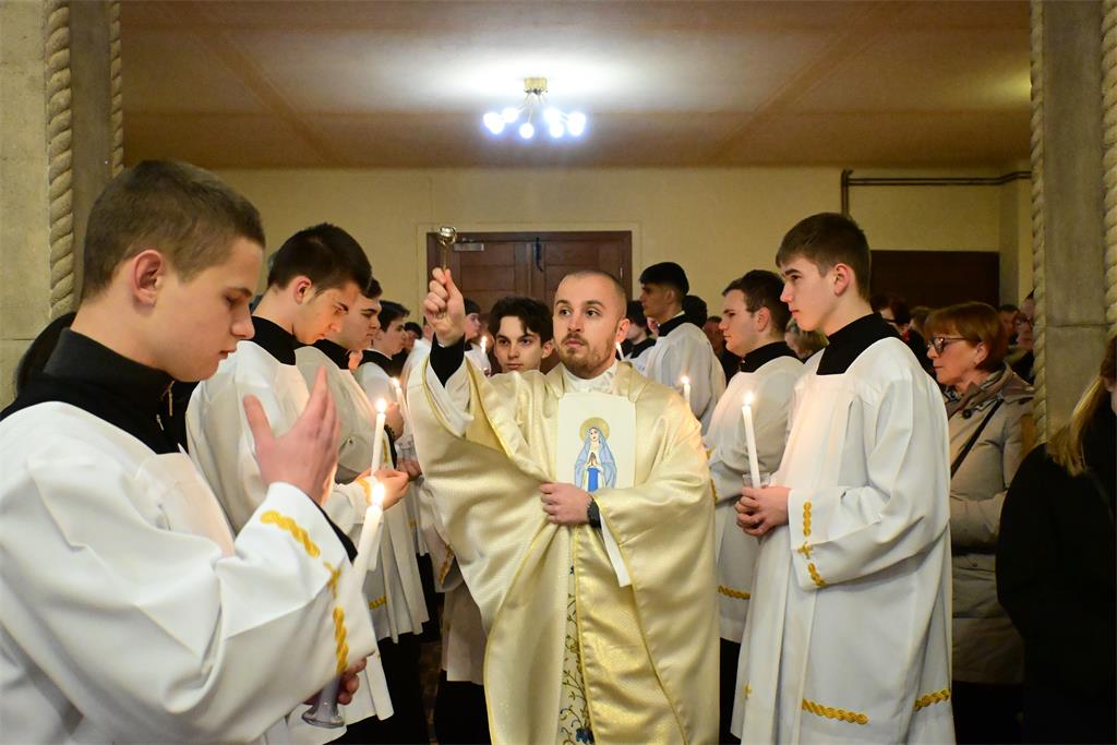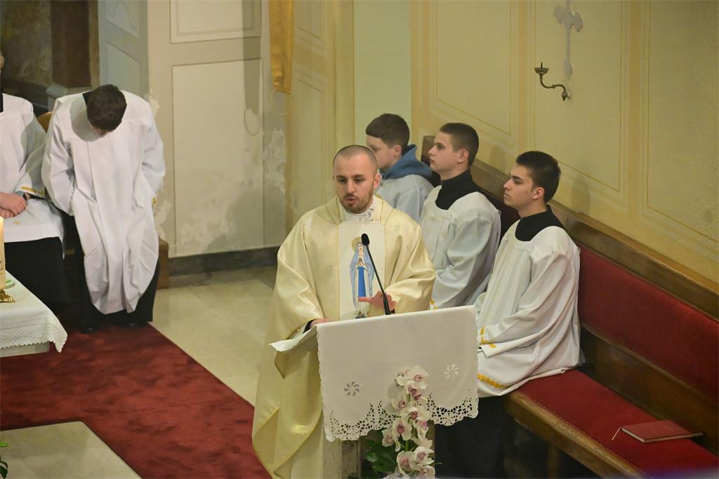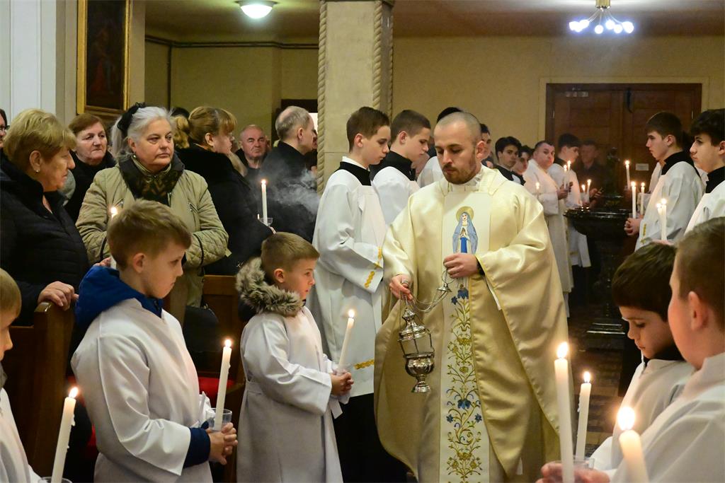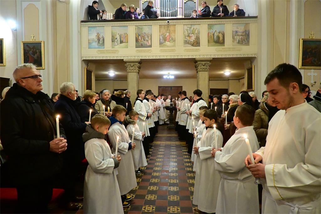 Misno slavlje počelo je ulaznom procesijom sjemeništaraca s upaljenim svijećama te blagoslovom svijeća na ulazu u župnu crkvu. Pozdravljajući sudionike slavlja vlč. Filipović je kazao kako se na blagdan Svijećnice žele zaustaviti pred otajstvom Isusova prikazanja u hramu, koje svoj vrhunac ima u Njegovu prikazanju na križu na kojem se darovao za nas. Posebno je pozdravio prisutne redovnike i redovnice, poželjevši im da se u njima učvršćuje i raste ono djelo Božje koje je počelo Njegovim pozivom da ga slijede na redovničkom putu.