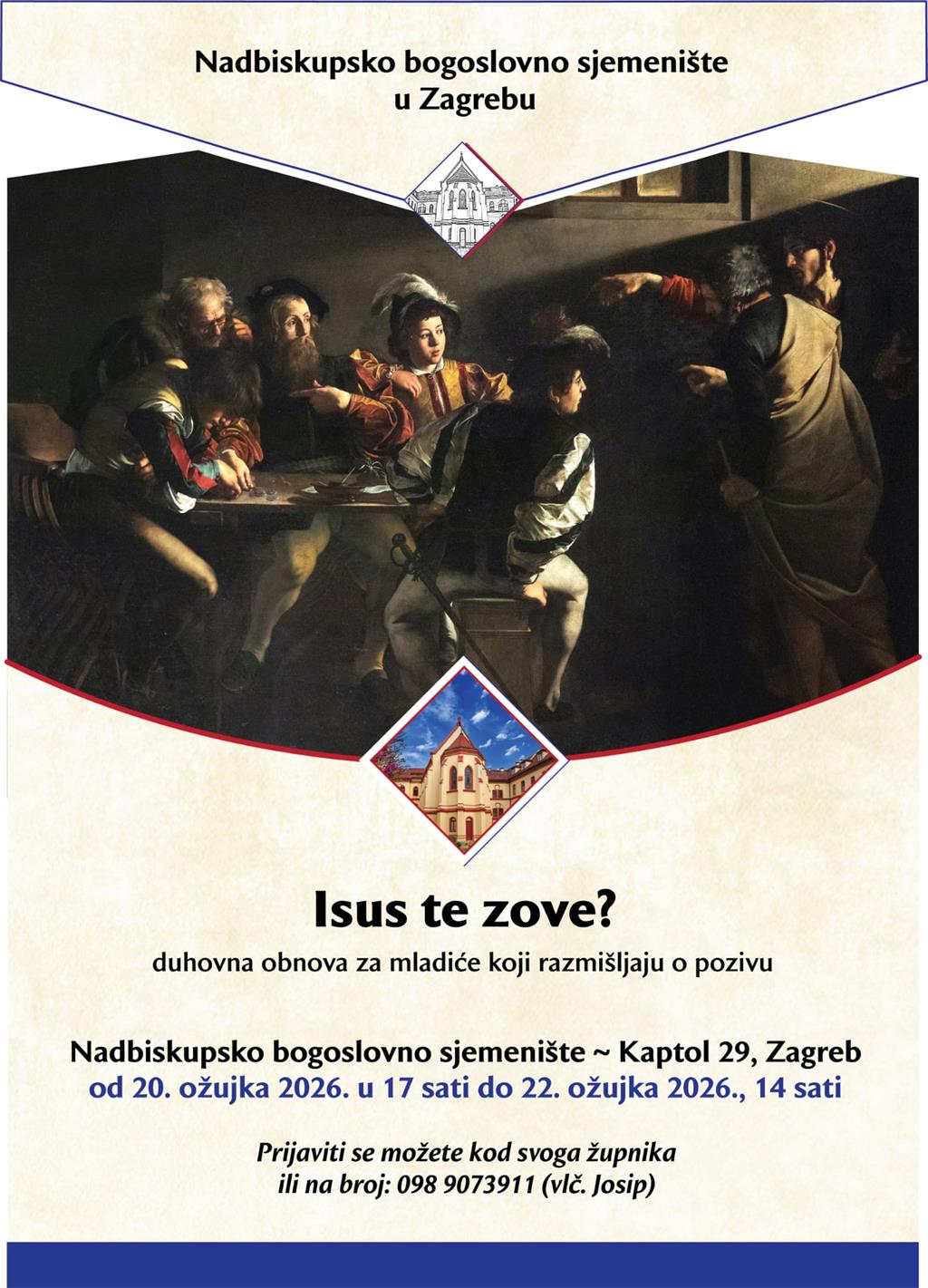 Duhovna obnova za mladiće koji razmišljaju o pozivu "Isus te zove?" održat će se u Nadbiskupskom bogoslovnom sjemeništu u Zagrebu (Kaptol 29) od petka 20. ožujka u 17 sati do nedjelje 22. ožujka u 14 sati.