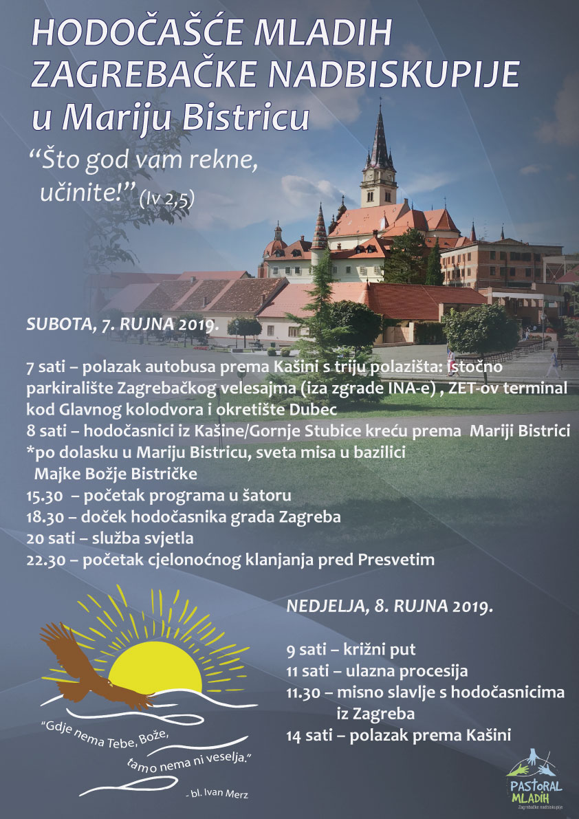 Kao i 288. zavjetno hodočašće vjernika grada Zagreba u Mariju Bistricu, tradicionalno će se hodočašće mladih Zagrebačke nadbiskupije u Hrvatsko nacionalno marijansko svetište Majke Božje Bistričke ove godine održati u subotu i nedjelju 7. i 8. rujna pod geslom „Što god vam rekne, učinite!“ (Iv 2,5).