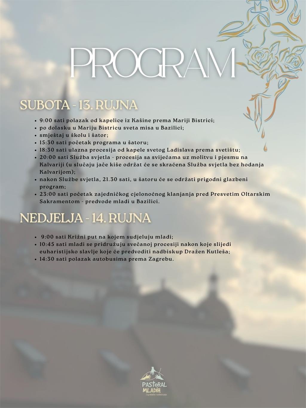 Hodočašće mladih održava se pod geslom "Čuj nas, Majko, nado naša!", a kreće od kapele sv. Tome i Vida u Kašini gdje će se mladi okupiti u subotu u 9 sati te krenuti pješice prema Mariji Bistrici.